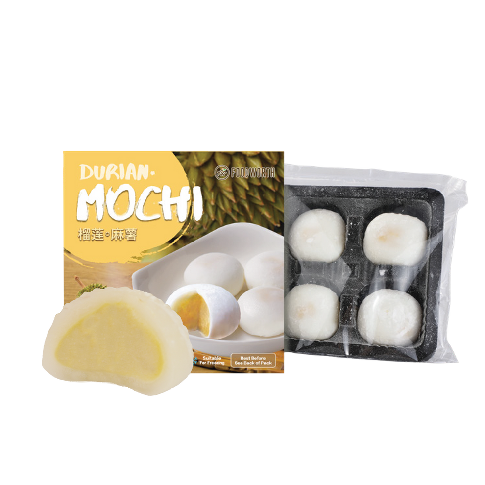 MUSANG KING DURIAN FLESH, WATER, GLUCOSE, MOCHI PREMIX FLOUR [GLUTINOUS RICE FLOUR, STARCH, FOOD ADDITIVES (ACETYLATED DIAMLY PHOSPHATE, ACETATE STARCH)], WHIPPING CREAM, THICKENER, CORN OIL, TAPIOCA FLOUR, SALT.